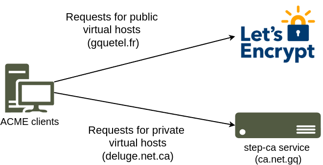 My ACME client is able to request certificates to both Let's Encrypt and my CA depending on the virtual host.